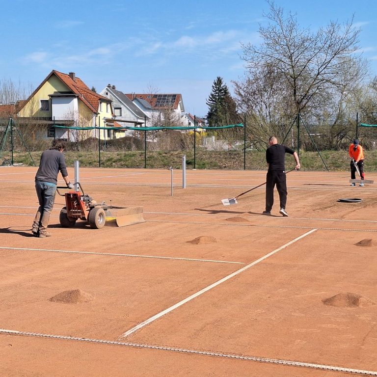 Mit vereinten Kräften wird daran gearbeitet, die 8 neuen Tennisplätze wieder in spielbereiten Zustand zu bringen.